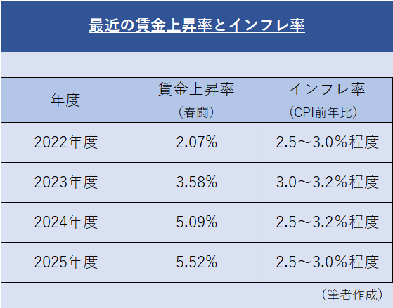 率の一覧です。2024年度の賃金上昇率(春闘)は